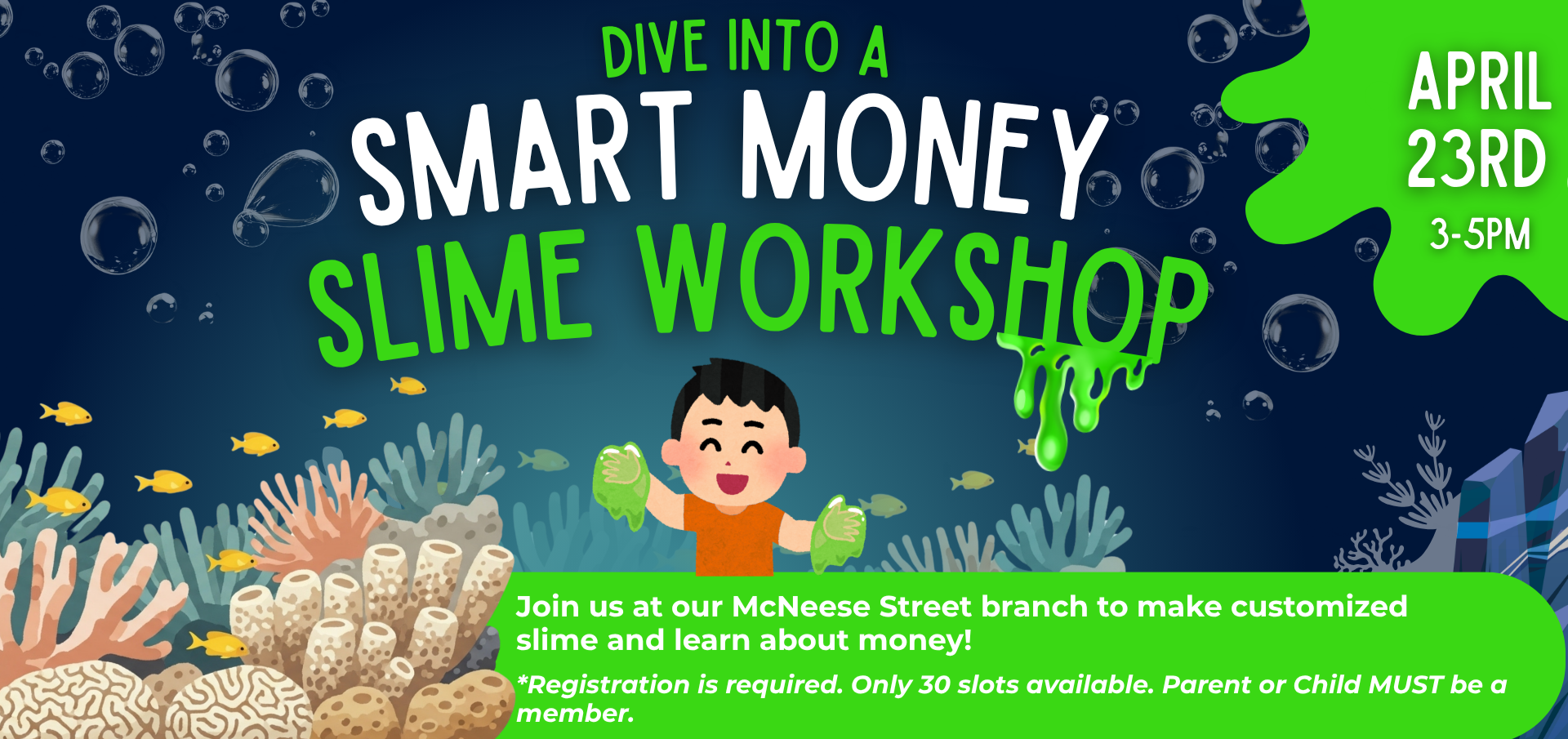 Let’s get messy and money-smart! Join us on April 23rd from 3–5 PM at our McNeese Street branch for a fun, hands-on financial workshop just for kids. They’ll create their own customized slime, enjoy snacks, and learn smart money habits along the way! Spots are limited to 30 participants, and registration is required. Child or parent must be a Southwest Louisiana Credit Union member to attend. Child participant must be between 5 and 17 years old to attend.